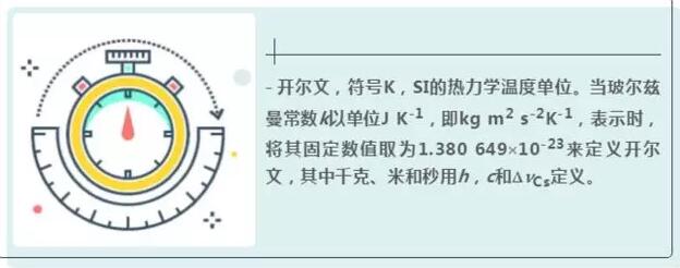 - 開(kāi)爾文,符號(hào)K,SI的熱力學(xué)溫度單位。當(dāng)玻爾茲曼常數(shù)k以單位J K-1,即kg m2 s-2K-1,表示時(shí),將其固定數(shù)值取為1.380 649′10-23來(lái)定義開(kāi)爾文,其中千克、米和秒用h,c和DnCs定義。