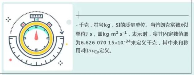 - 千克,符號(hào)kg,SI的質(zhì)量單位。當(dāng)普朗克常數(shù)h以單位J s,即kg m2 s-1,表示時(shí),將其固定數(shù)值取為6.626 070 15′10-34來(lái)定義千克,其中米和秒用c和DnCs定義。
