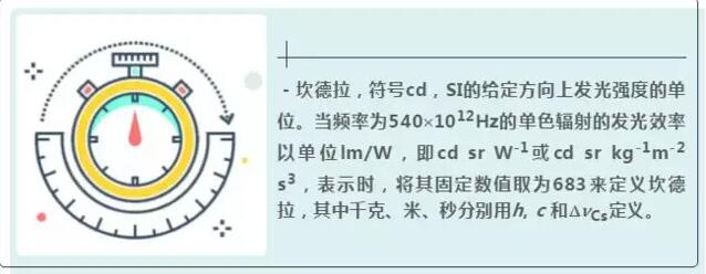 -坎德拉,符號(hào)cd,SI的給定方向上發(fā)光強(qiáng)度的單位。當(dāng)頻率為540′1012Hz的單色輻射的發(fā)光效率以單位lm/W,即cd sr W-1或cd sr kg-1m-2 s3,表示時(shí),將其固定數(shù)值取為683來(lái)定義坎德拉,其中千克、米、秒分別用h, c 和DnCs定義。